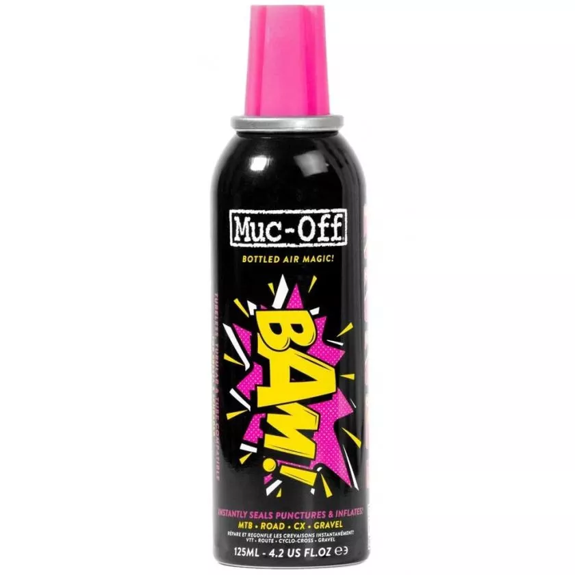 La bombe anti-crevaison Muc-Off B.A.M! (Bottled-Air-Magic) permet de gonfler et de réparer les crevaisons simultanément en injectant de la mousse latex et de l'air dans le pneu ou la chambre.